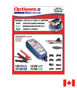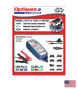 El OptiMate 2 DUO puede usarse para baterías de 12V de plomo y ácido (STD, AGM y GEL) y para baterías de 12,8/13,2V de litio (LiFePO4/LFP), usadas para arranque de motores y ciclo profundo. En baterías de 6Ah a 96Ah, se usa para el mantenimiento continuo y sin interrupciones de la batería. Puede recargar baterías de hasta 48Ah en 24 horas
