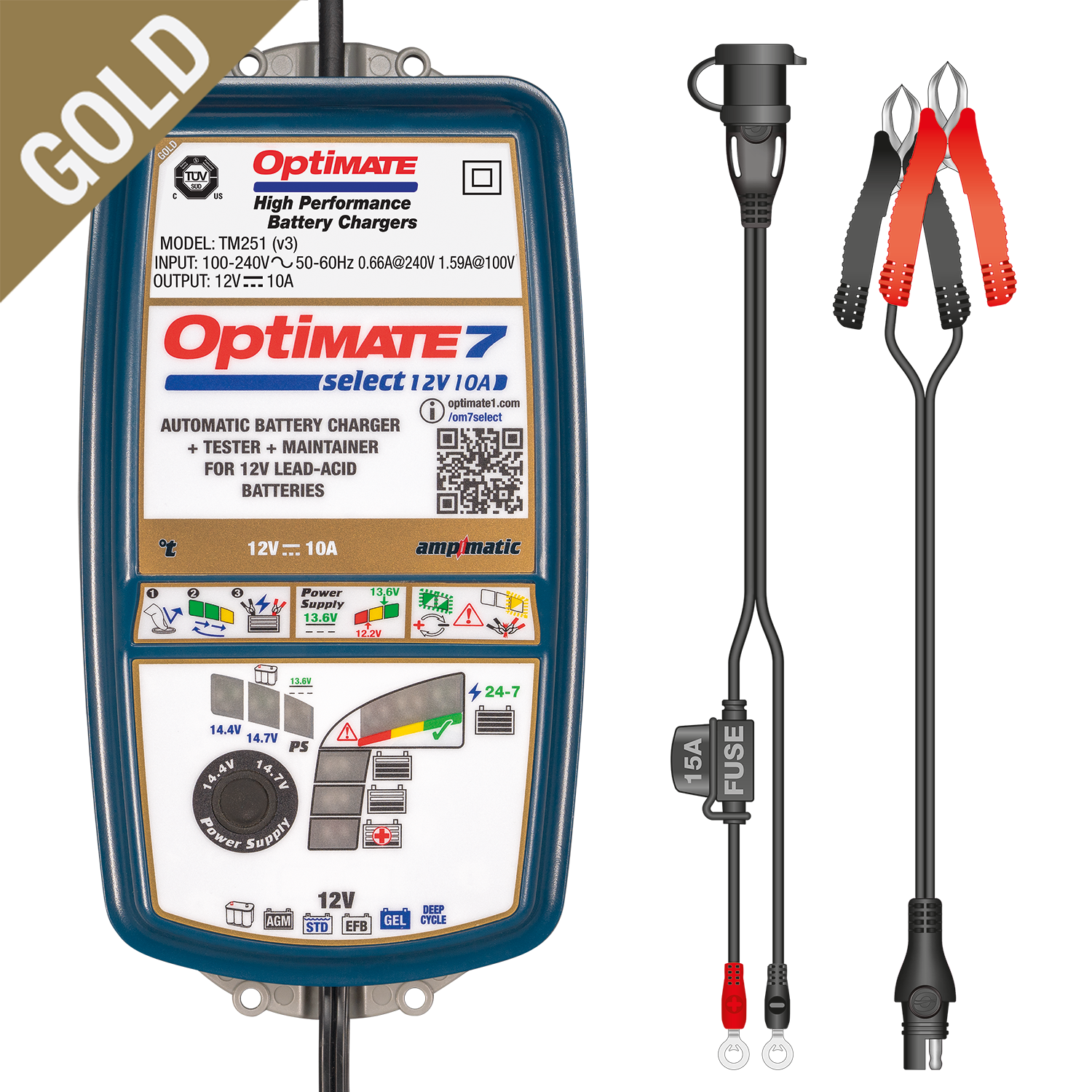 OptiMate 7 Select ‘serie GOLD’ es el cargador de baterías ‘elección PRO’ que saca todo el potencial de su batería de 12V de alto rendimiento– Incluye fuente de alimentación para apoyar la batería durante la puesta a punto / solución de problemas