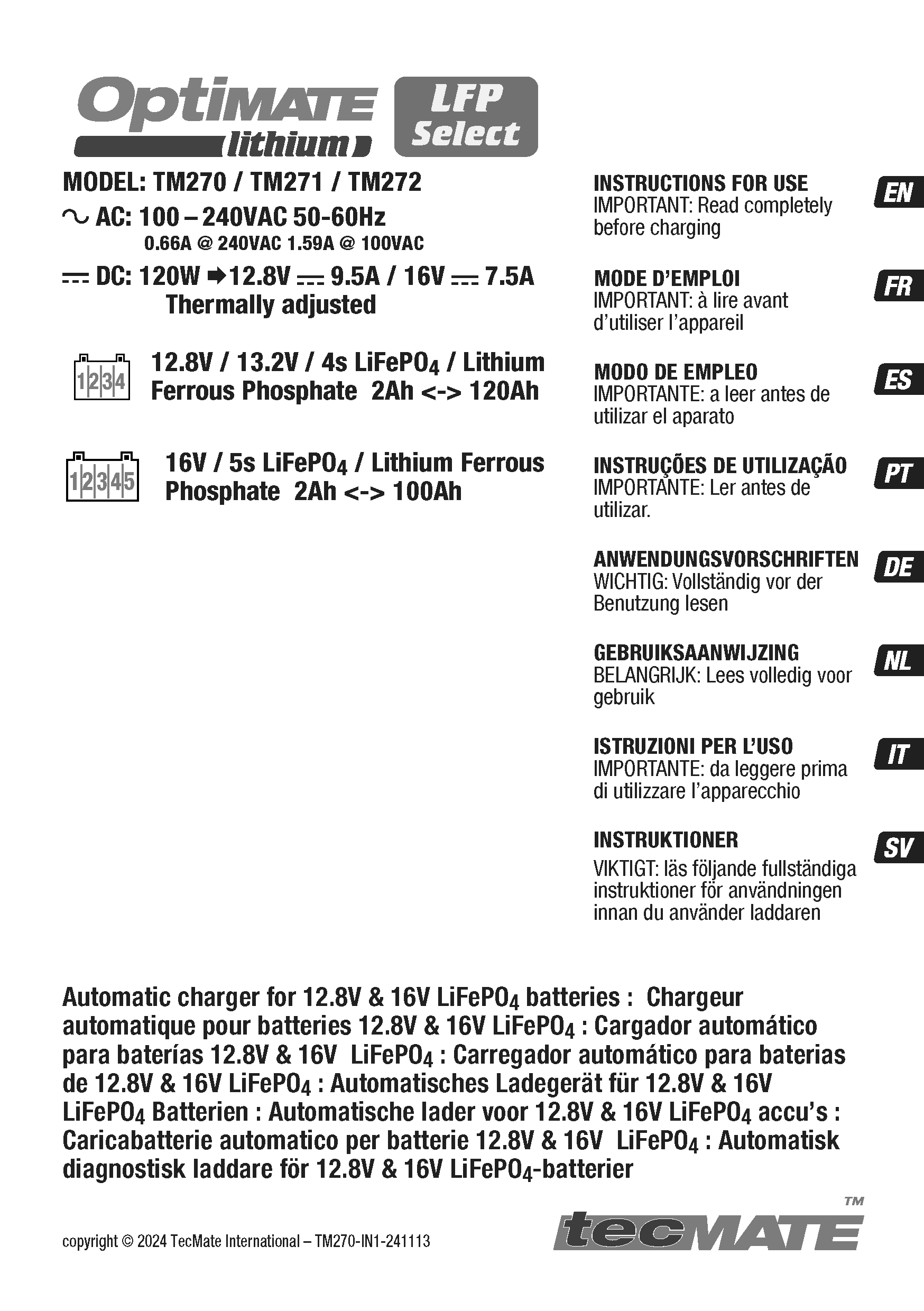 Seleccione 12.8V o 16V en función de la tensión de carga especificada para la batería LiFePO4/LFP de su embarcación, su coche o su motocicleta de carreras/gran cilindrada.