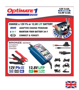 L'OptiMate 1 DUO peut être utilisé pour les batteries au plomb-acide (STD, AGM et GEL) de 12 V ainsi que pour les batteries au lithium (LiFePO4/LFP) de 12,8/13,2 V, utilisées pour le démarrage du moteur ou à décharge profonde. Pour des batteries de 2 Ah à 28 Ah, pour une maintenance de la batterie 24 h/24 et 7 j/7. Permet de recharger des batteries jusqu'à 15 Ah en 24 heures