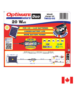INCLUSIEF: Weerbestendige accukabel, standaard accuklemmenset, 20W zonnepaneel en OptiMate Solar DUO-regelaar.