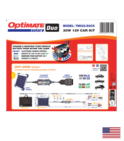 INCLUSIEF: OBDII-connector, standaard accuclipset, 20W zonnepaneel, OptiMate Solar DUO-controller, zuignappen en nylon opbergkoffer.