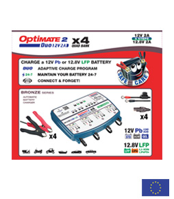 The OptiMate 2 DUO is suited for charging 12V lead acid and 12.8V / 13.2V Lithium (LifePO4 / LFP) batteries.