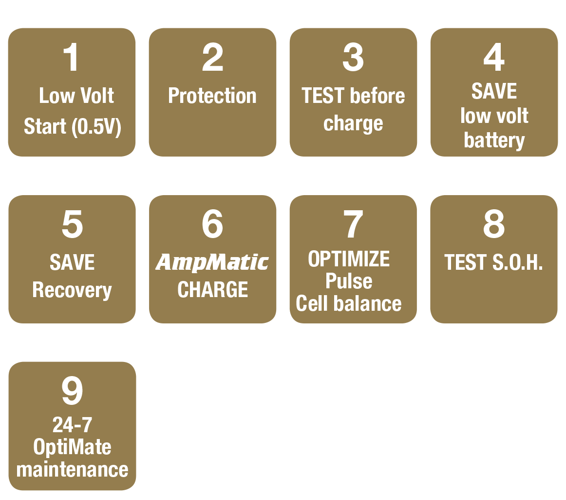 OptiMate SAVE mode unique by mode / battery type, safely* and automatically recovers a dead-flat battery from as low as 0.5 Volts.