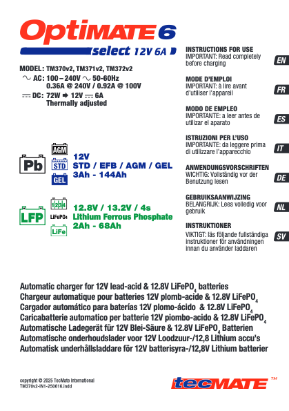 OptiMate 6 Select (version 2) is the ultimate 12V battery charger that can save, charge, test and maintain any type of 12V battery – Pb (lead-acid), AGM and lithium LFP.