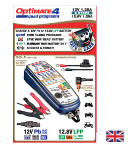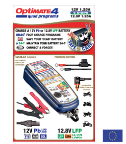 OptiMate 4 Quad Program Premium Edition is the ultimate battery charger for your BMW or Triumph adventure, touring, cruiser or performance motorcycle, ready to charge through the 12V DIN socket, or charge the battery directly on all other power-sport vehicles – the world’s most advanced power-sport battery charger!